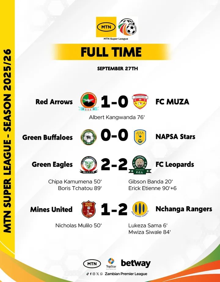 After the draw, Napsa Stars is 13th on the log with 6 points. Their next fixture is against Nchanga Rangers on October 4, 2025, in Chingola.